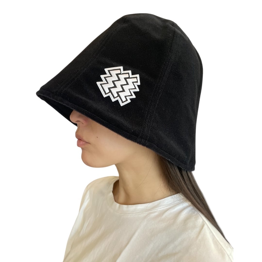 表側が面ファスナーのメスでできているので、サウナハット全体にワッペンを貼り付けることができます。両面とも厚手の素材なので耐熱性も高く、被り心地抜群です。